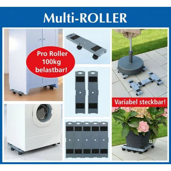 Der praktische Möbelroller kann nicht nur vielseitig eingesetzt werden, sondern ist auch noch beliebig erweiterbar. So lassen sich auch große oder sperrige Möbelstücke, wie Sofa, Schrank oder Regal sowie schwere Haushaltsgeräte oder Kübelpflanzen kinderleicht transportieren. Um den Multi-Roller zu erweitern, sind die einzelnen Transportelemente an den vier Seiten variabel und können entsprechend zusammengesteckt werden. Kinderleicht wird so das Gewicht des Transportguts optimal verteilt und ausbalanciert. Die Ladung kann also nicht kippen und so zu Unfälle führen.