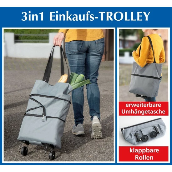 Die TROLLEY faltbare 3in1-Einkaufstasche der deutschen Marke WENKO ist eine praktische Einkaufstasche, die ausreichend Stauraum bietet und in Sekundenschnelle in einen mobilen Einkaufswagen umgewandelt werden kann. Mit Expander-Funktionen und integrierten Rädern erleichtert die Tasche den Transport von täglichen Einkäufen: Öffnen Sie einfach den Reißverschluss auf doppelten Stauraum.