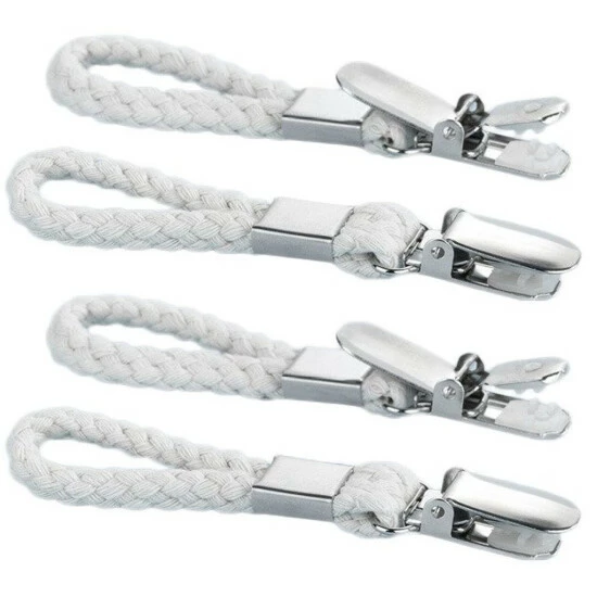 Das Set von Handtuchaufhängern besteht aus hochwertiger geflochtener Baumwolle in weiß. Das Gewebe ähnelt einem Seeknoten, was diesem Produkt ein schönes Aussehen verleiht. Die Clips bestehen aus Edelstahl, wodurch Kleiderbügel erfolgreich an nassen Orten eingesetzt werden können. Es gibt 4 Teile im Set. Maße (B x H x T): je 2 x 10,5 x 1 cm