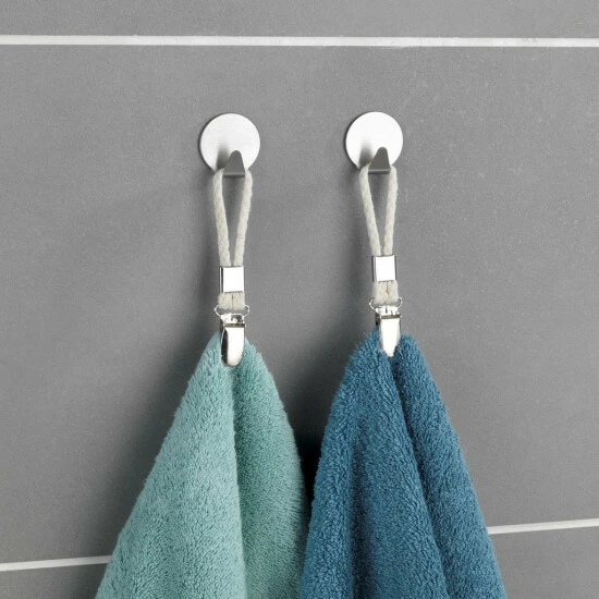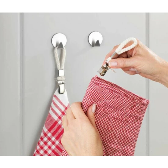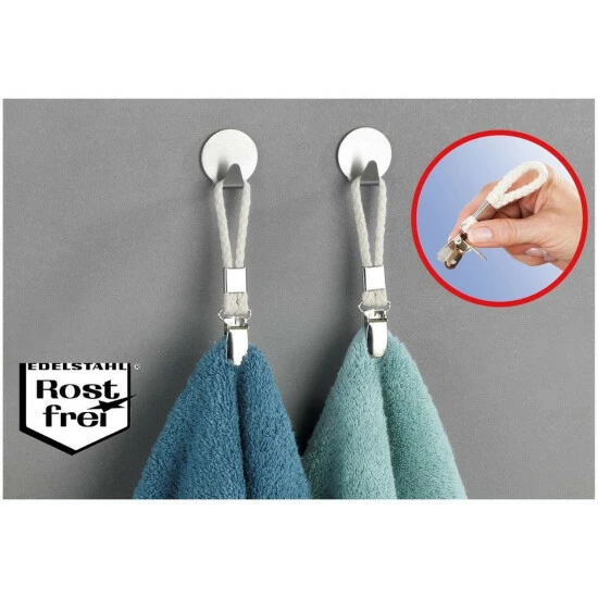 Bei abgerissenen Haken an Handtüchern und Co. behelfen Sie sich jetzt ganz einfach mit diesen strapazierfähigen Aufhängern. Das dicke, geflochtene Baumwollband hält selbst schwere Dusch- und Saunatücher oder Bademäntel sicher, ohne zu reißen. Mit dem praktischen Clip-Verschluss aus Edelstahl sind sie leicht am Stoff zu befestigen. Auch für Küchentücher, Topfhandschuhe u. a.