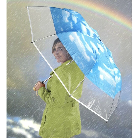 Ein außergewöhnlich dekorativer Regenschirm mit dem Motiv des fröhlichen Himmels und der Wolken. Aus strapazierfähigem und reißfestem Polyestermaterial. Es schützt sicher vor starkem Regen und Wind. Massive Metallstäbe biegen sich nicht von großen Böen ab. Großer Durchmesser – bis zu 122 cm macht den Regenschirm für zwei Personen geeignet. Nach dem Falten ist es 53 cm lang. Der Holzgriff bietet sicheren Halt.