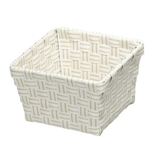 Dekorativer BadkorbHochwertiges Kunststoff-GeflechtAktuelle Trendfarben Weiß-BeigeQuadratische FormMaße (B X H X T): 14 X 9 X 14 Cm