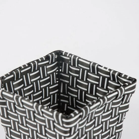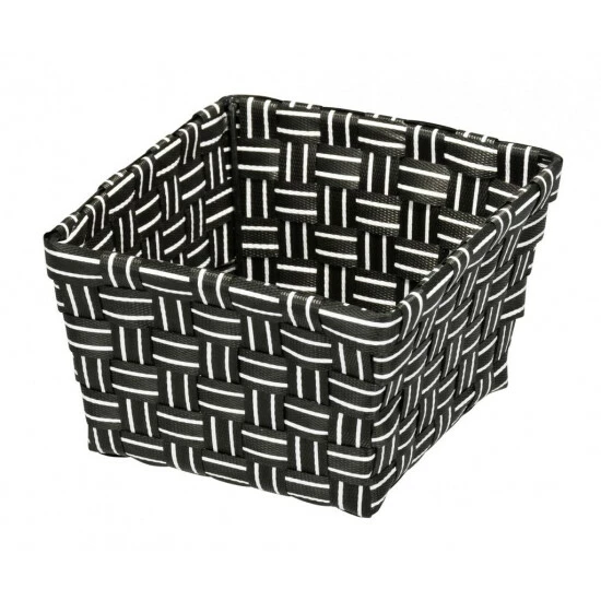 Dekorativer BadkorbHochwertiges Kunststoff-GeflechtAktuelle Trendfarben Schwarz-WeißQuadratische FormMaße (B X H X T): 14 X 9 X 14 Cm