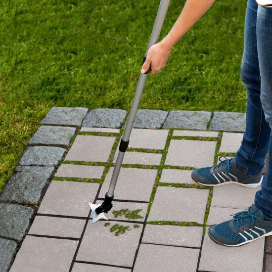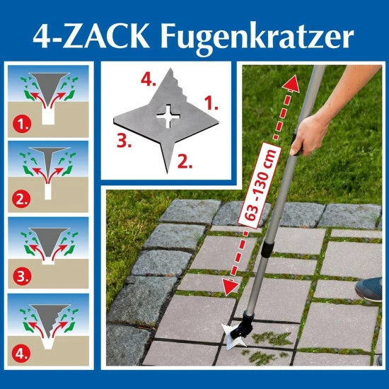 4-Zack-Fugenkratzer Mit dem Fugenkratzer geht es Unkraut und Moos an den Kragen. Dank seiner 4 unterschiedlichen Zacken kommt der Fugenkratzer in die kleinste Fuge und befreit Gehwege, Einfahrten oder Terrassen wirkungsvoll von lästigem Pflanzenbewuchs. Praktisch: Mit verstellbarem Gelenkkopf sowie ausziehbarem Teleskopstiel (55-122cm) für rücken- und knieschonendes Arbeiten. Umweltfreundliche Unkrautvernichtung, da ohne Einsatz von Chemie.