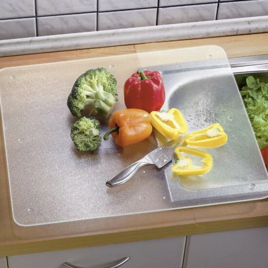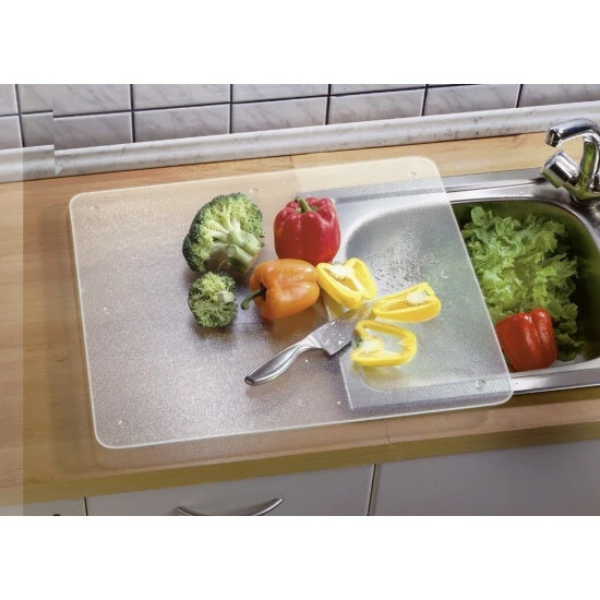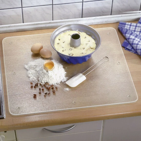 Die Glasplatte kann auch über das Spülbecken gelegt werden und den dort ungenutzten Platz als Arbeitsfläche füllen. Aufgrund ihrer Größe dient sie als ideale Unterlage beim Teigkneten und -ausrollen oder auch als Riesen-Schneidebrett für Fisch, Fleisch oder Gemüse.