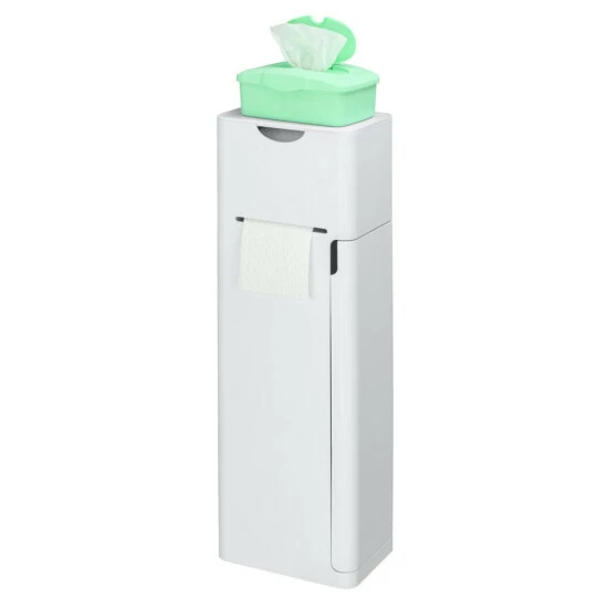 Die praktische Garnitur bietet sechs Funktionen und ist somit auch ideal für kleine Bäder geeignet. Neben der geschlossenen WC-Garnitur, dem geschlossenen Toilettenpapierrollenhalter für die sofortige Entnahme und dem Ersatzrollenfach bietet die clevere Box im unteren Bereich weiteren Stauraum für Reinigungsmittel, feuchtes Toilettenpapier oder die Bevorratung von Toilettenpapier. Im oberen Bereich finden sich zwei Fächer für Utensilien, wie Damen-Hygieneartikel o.ä. Der praktische Deckel dient zudem als Ablage für Handys & Co.