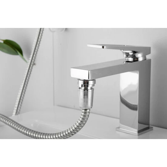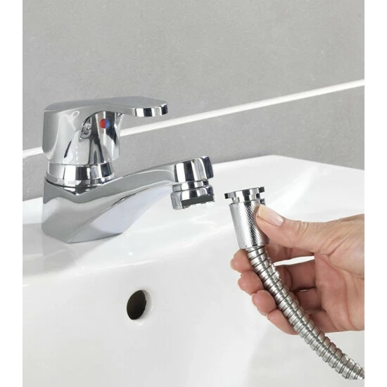 Mit höchster Qualität ausgestattet, passt die Waschbeckendusche auf eine Großzahl von Wasserhähnen. Der Duschschlauch ist dabei aus hochwertigem, rostfreiem Edelstahl gefertigt. Seine Länge (150 cm) macht die praktische Waschbeckendusche flexibel einsetzbar. Der Duschkopf aus silber-glänzendem Kunststoff (ABS) verfügt über pflegeleichte Anti-Kalk-Noppen.