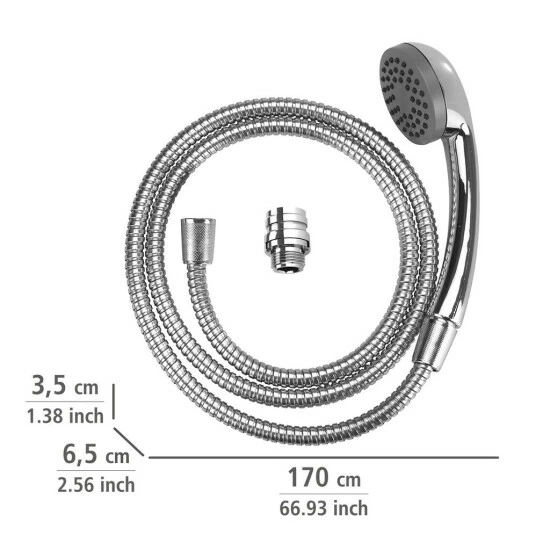 Mit dieser praktischen Handbrause von Wenko können Sie sich überall bequem die Haare waschen! Der Schlauch ist 150 cm lang, so dass Sie genug Platz haben, um leicht zu wenden. Diese Handbrause hat außerdem Anti-Kalk-Noppen und einen Adapter für Innen- und Außengewinde, wodurch sie leicht zu warten ist und auch an die meisten Wasserhähne angeschlossen werden kann.