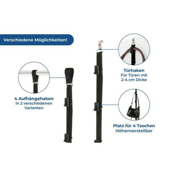 Die Taschengarderobe bietet viel Platz für Handtaschen und spart Platz im Schrank bzw. in der Wohnung. Einfach über die Tür oder einen Kleiderständer spannen und bis zu 8 Taschen aufhängen. Die Aufhängehaken sind auf die gewünschte Höhe einstellbar. Die Garderobe ist für Türbreiten von 2-4 cm geeignet.