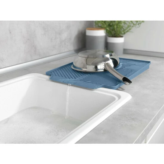 Die praktische Geschirr-Abtropfmatte ist aus robustem Kunststoff (TPR) gefertigt und im angesagten Blau gehalten. Natürlich bietet WENKO noch viele weitere clevere Küchenhelfer im passenden Blau an. Dieser Look macht die Küche zum wahren Wohlfühlort.