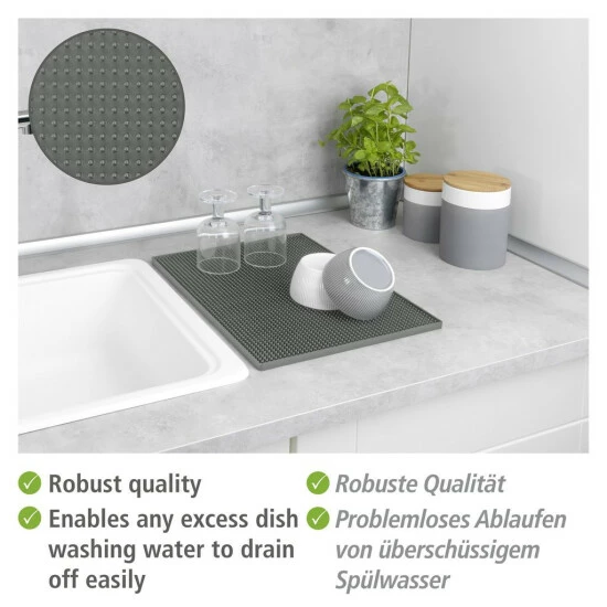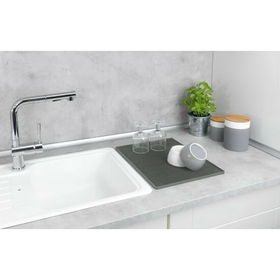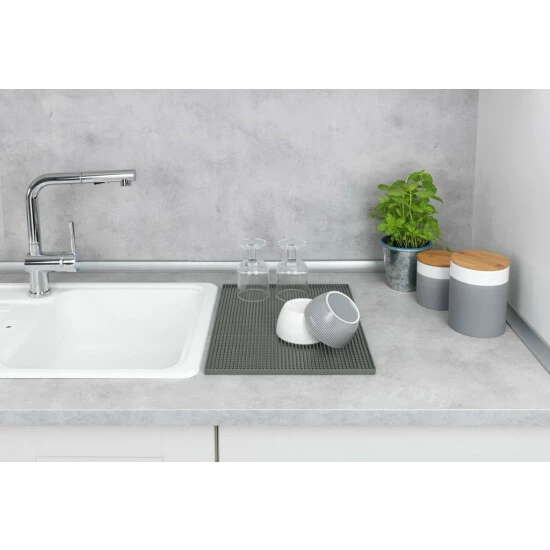 Ein hilfreiches Spül-Zubehör für alle, die eine zusätzliche Abtropffläche benötigen oder bei denen diese am Spülbecken fehlt. Die Abtropfmatte Maxi von WENKO in Grau bringt in ihrem ansprechenden Design neue Impulse in den Küchenalltag.