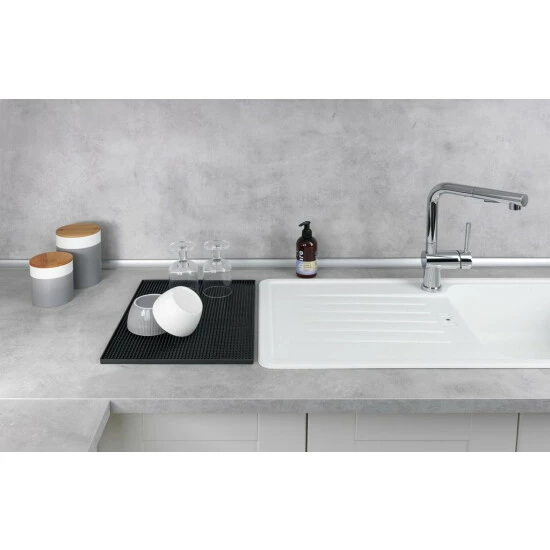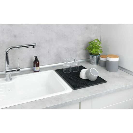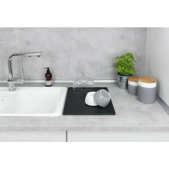 Die robuste Abtropfmatte aus Kunststoff sorgt mit über 2.700 Noppen für einen sicheren Halt aller hochwertigen Gläser, Tassen und Teller. Durch die Noppenstruktur kann das überschüssige Spülwasser problemlos ablaufen und das Geschirr trocknet schneller. Diese clevere Trocken-Matte eignet sich auch ideal zum aufrechten Abtropfen von Schneidebrettern. Besonders clever: Zur Reinigung kann die schwarze Maxi Spülbeckenmatte bei maximal 75° C in der Spülmaschine gereinigt werden. So haben Sie es jederzeit hygienisch sauber am Waschbeckenrand!