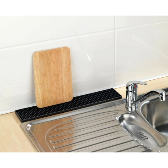 Durch ihre schlanke Form passt die Geschirrmatte optimal neben die Spüle oder zwischen Spüle und Wand, wodurch die Matte auch ideal zum Abtropfen von Brettchen geeinigt ist.