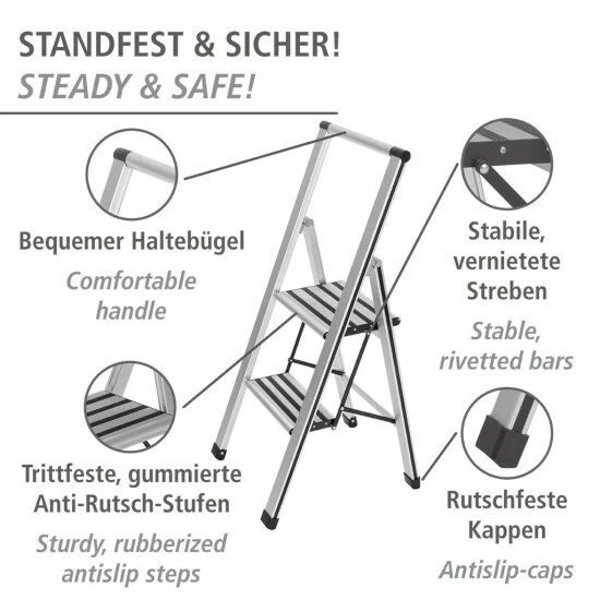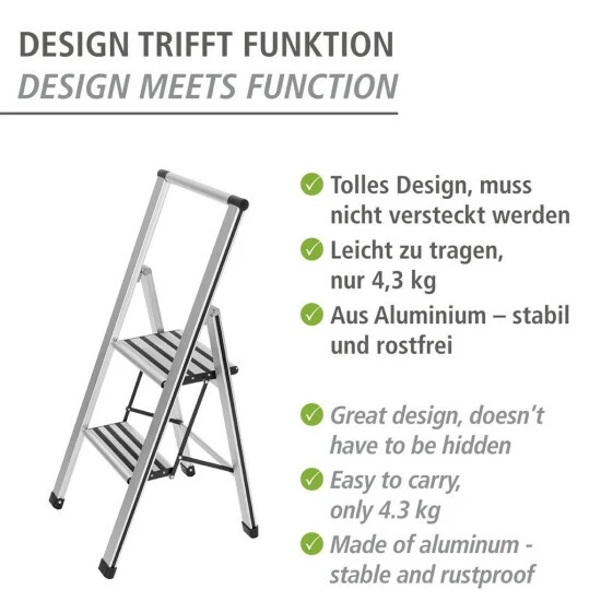 Die 2-stufige Alu-Design Trittleiter von WENKO sorgt für sicheren Halt bei Arbeiten, die in die Höhe gehen. Egal ob beim Gardinen aufhängen, Fenster putzen oder der Gartenarbeit, die innovative Leiter verspricht eine optimale Standsicherheit bei einer Standhöhe von 50 cm – kein unsicheres Balancieren und Wackeln mehr.