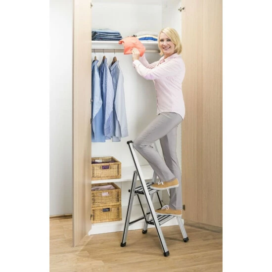 Die 2-stufige Leiter wird nützlich sein, wenn Sie Gegenstände in hohen Regalen, bei der Fensterreinigung oder bei Renovierungsarbeiten suchen. Perfekt für Zuhause, Garage, Werkstatt oder Keller. Stabile und dennoch leichte Aluminiumkonstruktion. Steel. Ausgestattet mit großen rutschfesten Treppen mit einer Gummioberfläche. Es nimmt wenig Platz ein, wenn es gefaltet wird. Gewicht 4,5 kg.