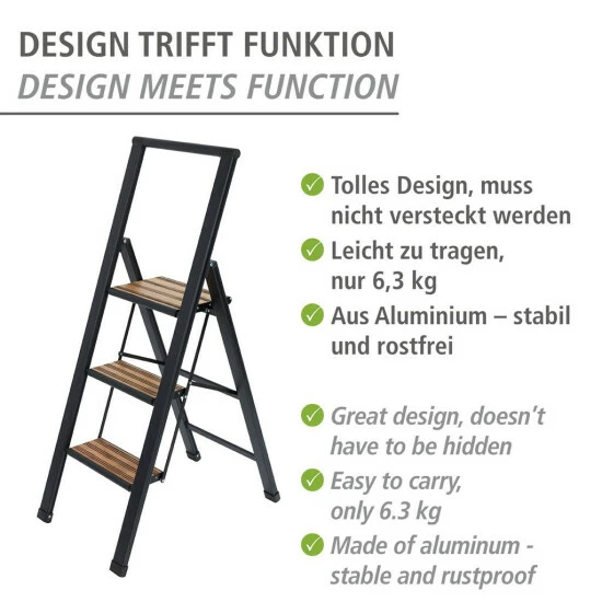 Schwarze 3-Grad-Klappleiter, renommiertedeutsche Marke WENKO hat ein leichtes Aluminium-Design, so dass es sehr leicht zu bewegen und sogar die Treppe hinauf zu bringen. So ist es auch für Frauen oder ältere Menschen geeignet. Darüber hinaus ist es sehr einfach zu falten, so dass es nicht viel Platz im Haus in Anspruch nimmt.