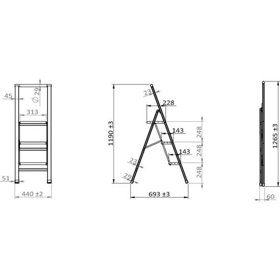 Ausgeklappt hat die Leiter ein Maß von (B x H x T): 44 x 119 x 69 cm. Abhängig von der Körpergröße kann eine Arbeitshöhe von ca. 255 cm erreicht werden.