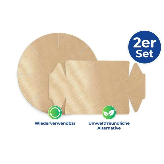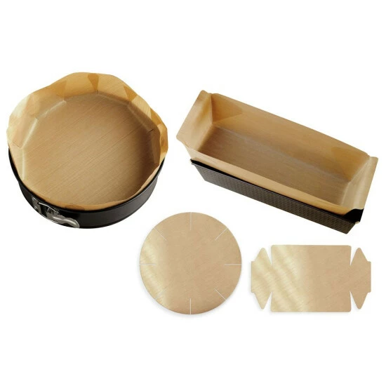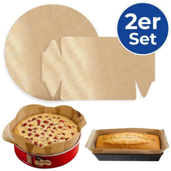 Im Lieferumfang sind zwei Zuschnitte in runder und eckiger Form enthalten. Der runde Zuschnitt eignet sich für runde Backformen bis Ø 26 cm. Der eckige Zuschnitt eignet sich für eckige Backformen bis 25 cm Länge.