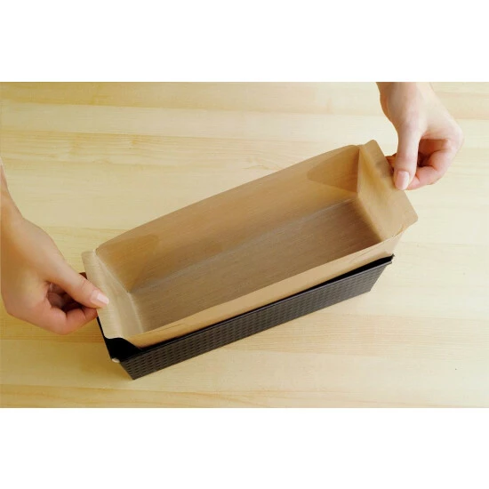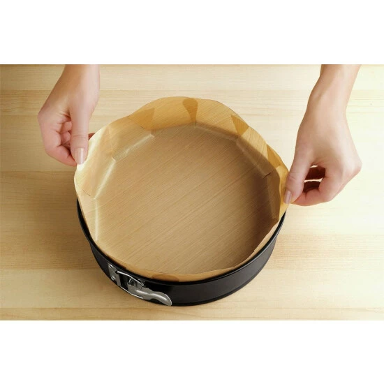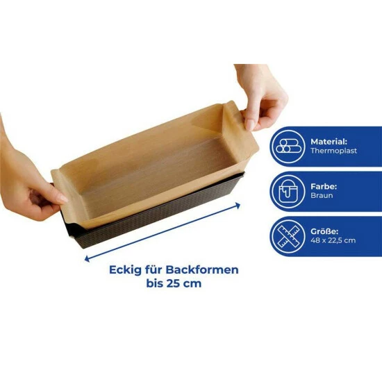 Der braune Backform-Zuschnitt ist eine neue Antihaft-Folieneinlage. Diese wurde speziell für das problemlose Backen ohne zusätzliches Einfetten entwickelt. Durch einfaches Einlegen des Zuschnittes in die Backform lässt sich jeder Kuchen nach dem Backen unversehrt aus der Form lösen.