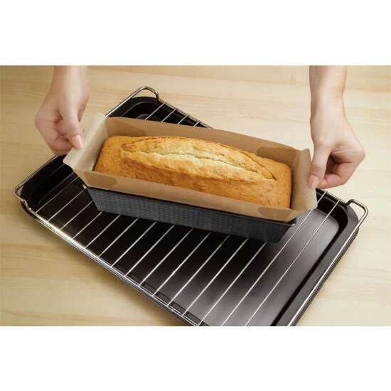 Diese Dauer-Folie ersetzt den Kauf von immer neuem Backpapier und ist mit handlichen Griffen zu leichten Entnahme des Kuchens ausgestattet.