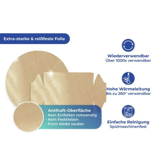 Die Folie besteht aus einer Antihaft-Oberfläche (PTFE), die ermöglicht, dass sich alles problemlos, ohne festzukleben und anzubacken, wieder löst. Die Form bleibt sauber und das lästige Spülen entfällt.