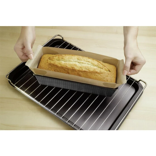 Diese Dauer-Folie ersetzt den Kauf von immer neuem Backpapier und ist mit handlichen Griffen zu leichten Entnahme des Kuchens ausgestattet.