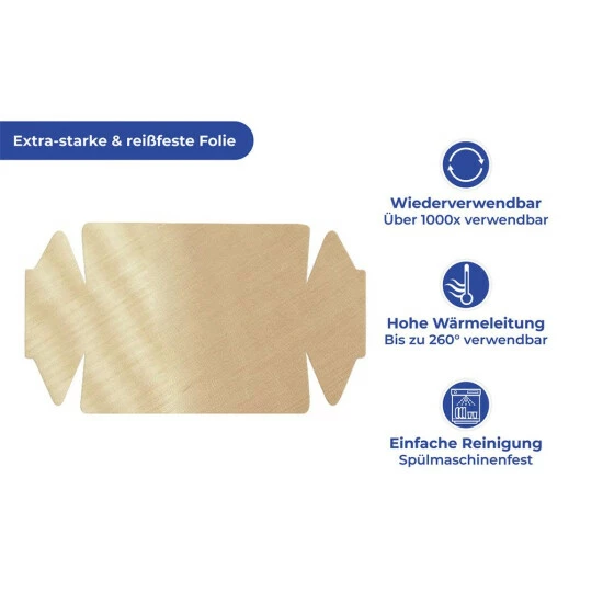 Der praktische Antihaft-Backform Zuschnitt ist bis über 1000 Mal wiederverwendbar und leicht zu reinigen (spülmaschinenfest). Die hochwertige Folie hat eine hervorragende Wärmeleitung und ist auch bei hohen Temperaturen bis 260º C verwendbar.