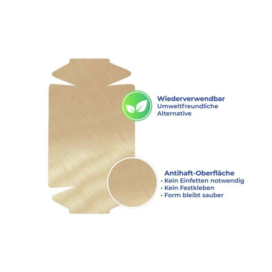 Der braune Backform-Zuschnitt ist eine neue Antihaft-Folieneinlage. Diese wurde speziell für das problemlose Backen ohne zusätzliches Einfetten entwickelt. Durch einfaches Einlegen des Zuschnittes in die Backform lässt sich jeder Kuchen nach dem Backen unversehrt aus der Form lösen.