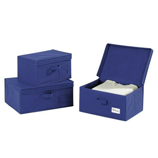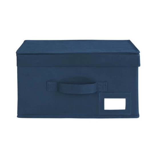 Universelle Aufbewahrungsbox aus atmungsaktivem, strapazierfähigem Material in neutralem und dennoch elegantem Marineblau. Ein funktionales Produkt, das das Auge erfreuen wird und vor allem die Organisation von Wohnraum erleichtert. Modell aus dem der deutschen Firma WENKO, die berühmt für seine hochwertigsten Materialien und Sorgfalt für verschiedene Arten von Innenausstattung ist. 34 x 19 x 24 cm Box mit einem handlichen Griff für einfache Handhabung und einem Etikettenfenster zum schnellen Auffinden von gelagerten Gegenständen.