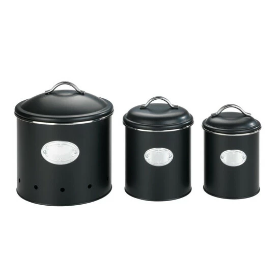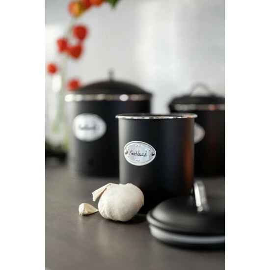 Die praktischen Aufbewahrungsdosen Nero von WENKO sind aus lebensmittelechtem, schwarz lackiertem Metall gefertigt und bringen durch ihr Retro-Design einen nostalgischen Charme in die Küche. Ein silberfarbenes Schild aus Aluminium, das auf den Dosen angebracht ist, lässt sich leicht mit einem Stift beschriften, somit ist immer sichtbar, welche Lebensmittel sich in den Boxen befinden.