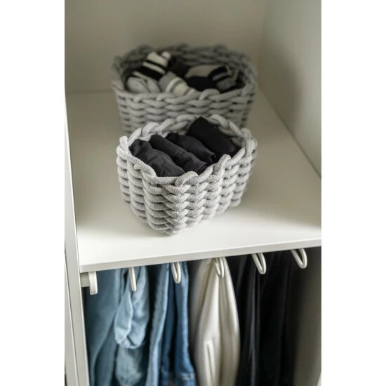 Hergestellt aus gestrickter Baumwollschnur lauten die verwendeten Materialien des Flechtkorbes wie folgt: 38,5 % Polyester, 36,5 % Baumwolle, 19,8 % Viskose, 5,2 % Polyamid.