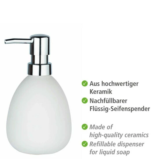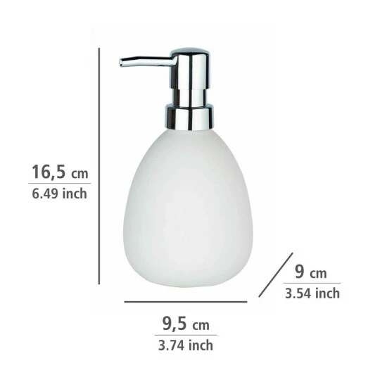 Der Seifenspender Polaris in Weiß kann individuell mit bis zu 390 ml Flüssigseife oder Waschlotion gefüllt werden. Durch leichten Druck auf den Dosierknopf wird die gewünschte Menge Seife oder Lotion herausgepumpt. Auch im Gäste-WC oder in der Küche macht der charmante Seifenspender eine gute Figur. Durch die elegante Farbgebung und das besondere Design setzt der geschmackvolle Seifenspender moderne, puristische Akzente in den heimischen vier Wänden.