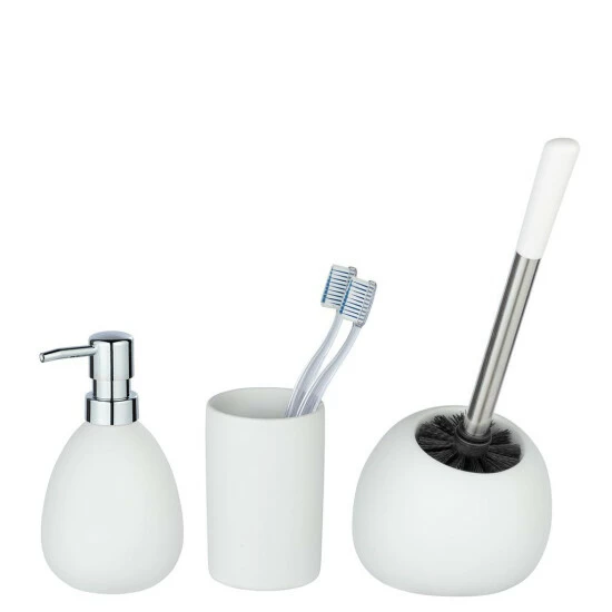 Lieferumfang: Bad-Accessoire Set Polaris von WENKO, 1 x Zahnputzbecher, 1 x Seifenspender und 1 x WC-Garnitur, aus Keramik, Maße Mundspülbecher: (B/T x H): Ø 7,5 x 11,2 cm. Maße Bürstenhalter: (B x H x T): 15 x 34,5 x 14,5 cm, mit Toilettenbürste, Maße Seifendosierer (B x H x T): 10 x 16,5 x 9,4 cm, Füllmenge 390 ml, Weiß matt.