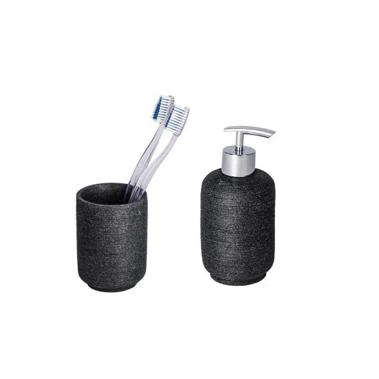 In diesem praktischen Bad-Set sind ein Seifenspender und ein Zahnputzbecher enthalten.