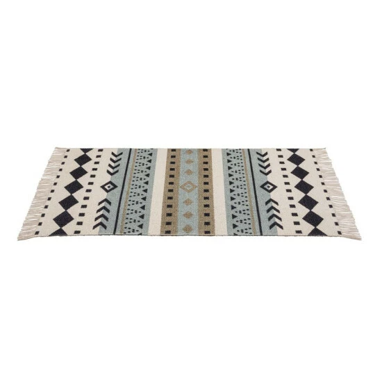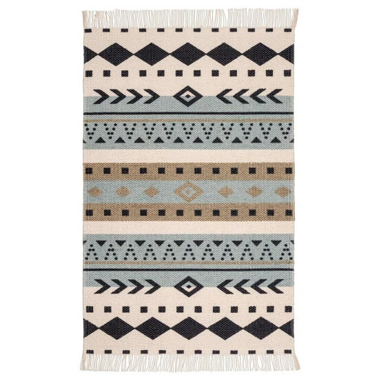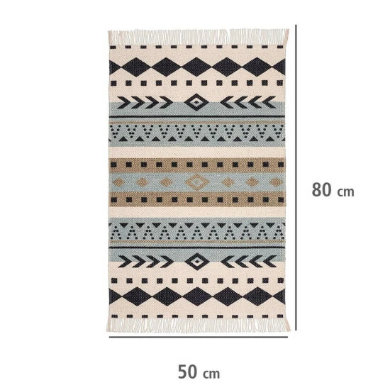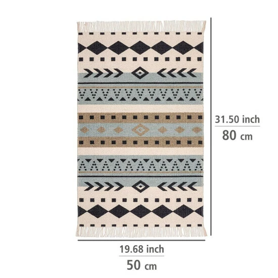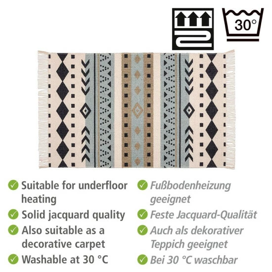 Sie wollen Ihrem Bad einen natürlichen und gleichzeitig modernen Look verpassen? Mit der Badematte Bere liegen Sie voll im Trend. Das symmetrische Ethno-Muster in Blau- und Beigetönen, kombiniert mit Schwarz, verleiht ihrem Bad-Fußboden einen angesagten Touch. Die Matte eignet sich mit ihren Maßen von (B x T): 50 x 80 als Duschvorleger, Badematte vor der Wanne oder dem Waschbecken oder als dekorativer Teppich. Die Unterseite der Badematte ist rutschhemmend beschichtete, sodass sie auch auf Fliesen für einen sicheren Stand sorgt. Die Matte ist bei bis zu 30°C waschbar und für Fußbodenheizung geeignet.