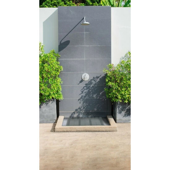 Aus stabilem Kunststoff in modernem Grau gehalten ergänzt die praktische Badematte Indoor & Outdoor die Badezimmer-Einrichtung um ein funktionelles Element.
