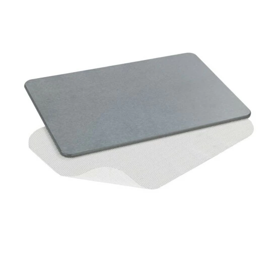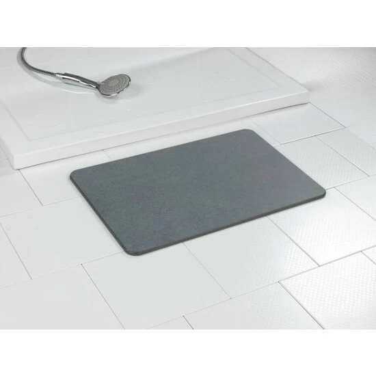 Der dekorative Badvorleger in Grau ist aus natürlichem, langlebigem Kieselgur mit sehr hohen wasserabsorbierenden und schnelltrocknenden Eigenschaften gefertigt. Das Kieselgur Pulver im Inneren der Matte sorgt dank seiner Diffusionseigenschaft dafür, dass Ihre nassen Füße in Sekundenschnelle trocknen und sie mit entwässerten Füßen nach Ihrem Badehandtuch greifen können. Trotz dieses Merkmals entstehen durch den Badteppich keine unangenehmen Gerüche, denn auch die Nässe auf der Mattenoberfläche verschwindet wie durch Zauberhand in kürzester Zeit.