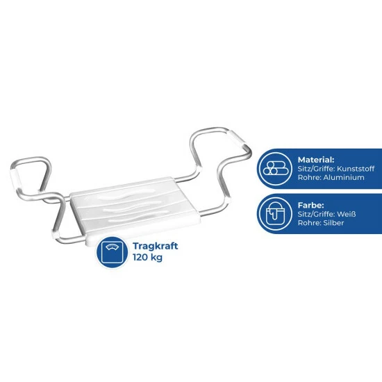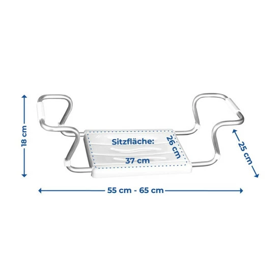 Der Badewannensitz aus hochwertigem Kunststoff wird für Menschen mit Rückenproblemen, ältere Menschen, Behinderte und Menschen mit Sitz- und Aufstehproblemen empfohlen. Der Badewannensitz sorgt für eine komfortable und sichere Durchführung aller Hygienevorgänge, ohne tief in der Badewanne sitzen zu müssen. Der profilierte, bequeme Sitz sorgt für Stabilität. Dank der Möglichkeit, die Stangen in der Breite von 55 bis 65 cm einzustellen, passt der Sitz auf alle Standardbadewannen. Spezielle Überzüge auf Aluminiumstangen verhindern auch Kratzer auf der Badewannenoberfläche.