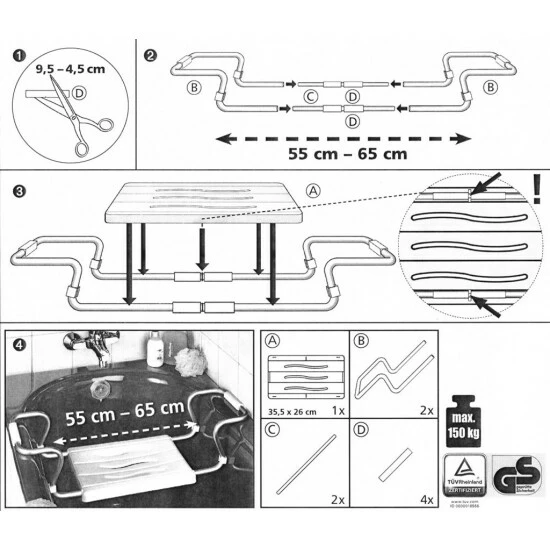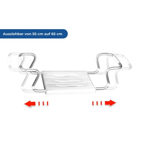 Seine Breite lässt sich variieren von 55 bis 65 cm, so dass er auf alle gängigen Badewannen passt.