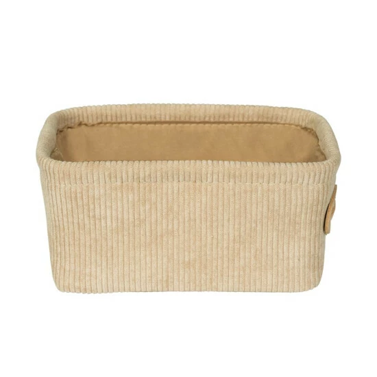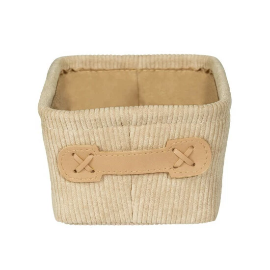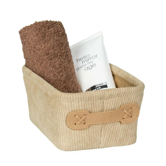 Die Optik des weichen Cord-Designs mit seiner typischen Rippenstruktur sorgt für Behaglichkeit und bringt mit seiner naturnahen Farbgebung in Beige Wärme und Gemütlichkeit ins Bad. Als Kontrast macht der farblich leicht abgesetzte Griff aus Kunstleder den Badkorb zu einem kleinen Highlight. An dem kleinen Griff lässt sich das Körbchen leicht aus Regal- oder Schrankfächern herausziehen.