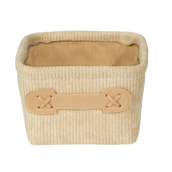Die Optik des weichen Cord-Designs mit seiner typischen Rippenstruktur sorgt für Behaglichkeit und bringt mit seiner naturnahen Farbgebung in Beige Wärme und Gemütlichkeit ins Bad. Als Kontrast macht der farblich leicht abgesetzte Griff aus Kunstleder den Badkorb zu einem kleinen Highlight. An dem kleinen Griff lässt sich das Körbchen leicht aus Regal- oder Schrankfächern herausziehen.