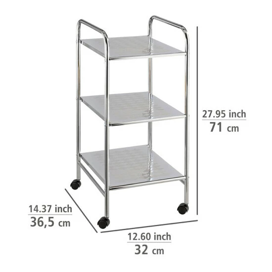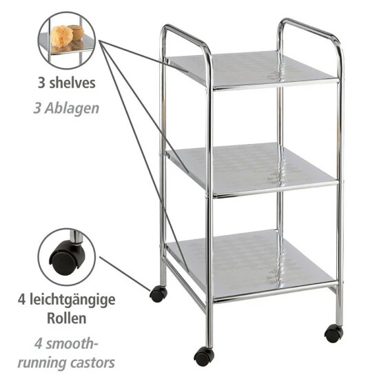 Haushaltswagen sind in vielen Ausführungen und in unterschiedlichen Materialien erhältlich. Ob aus Holz, Kunststoff oder Metall – wählen Sie einen Servierwagen, der Ihren Bedürfnissen entspricht. Der Badwagen Sando von WENKO stellt mit seinen drei Ebenen auf stilvolle Weise komfortable Stellfläche auf praktischen Rädern zur Verfügung.