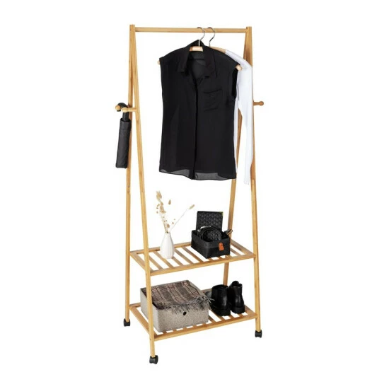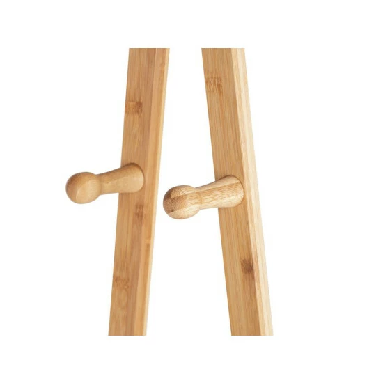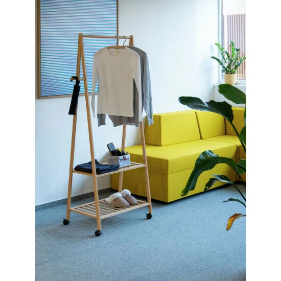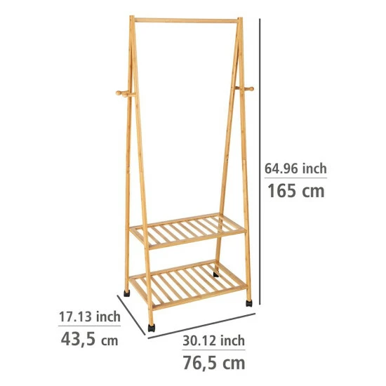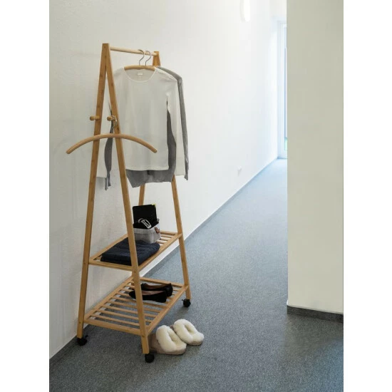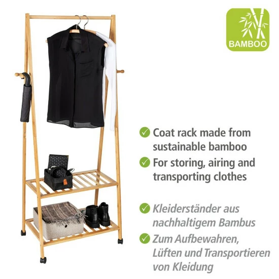 Das Gestell des Kleiderständers besteht aus Bambus – einem schnell nachwachsenden Rohstoff, der in Sachen Nachhaltigkeit punktet. Ergänzt wird der Kleiderständer durch vier große Rollen aus schwarzem Kunststoff, die ein leichtes Fortbewegen des Ständers ermöglichen. Dafür, dass die Standgarderobe an Ort und Stelle bleibt, sorgen zwei an den Rollen befindliche Feststellbremsen.