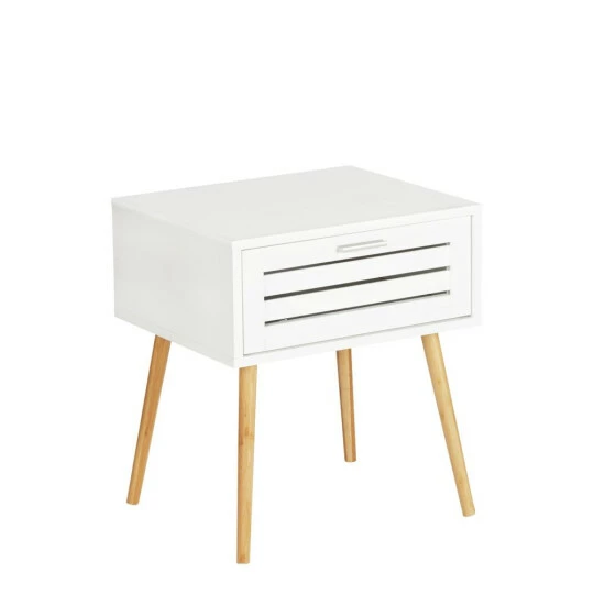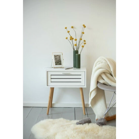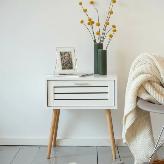 Lieferumfang: 1 x Finja Beistelltisch mit praktischer Schublade, Schrauben, Beine, Maße (B x H x T): 45 x 50 x 38 cm, in Weiß/Natur