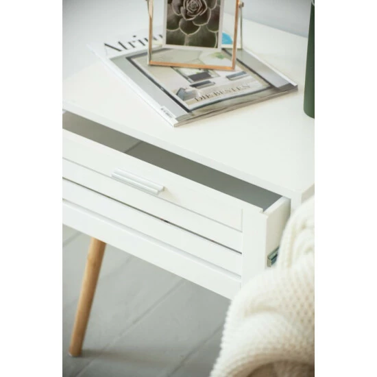 Ein Must-Have für jeden Haushalt: Ein Beistelltisch ist eine tolle Alternative zu einem großen Couchtisch, da er auch gut neben dem Sofa platziert werden kann. Als Ablage für eine Tasse Kaffee oder die Fernbedienung ist er bestens geeignet. Auch als Deko-Element in einer Ecke mit einer schönen Grünpflanze ist der Tisch ein hübscher Hingucker. Und im Schlafzimmer macht das Tischchen als Nachttisch eine gute Figur. Außerdem bietet der Tisch in seiner großzügigen Schublade (42,5 x 15 x 35 cm) auch jede Menge Stauraum für Naschereien, Accessoires, Strickzeug sowie private Gegenstände, die nicht jeder sehen soll