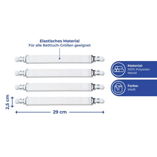 Die elastischen Spanner sind für alle Betttuchgrößen geeignet. Kein Verrutschen des Bezuges mehr. Halten das Betttuch am richtigen Platz. Einfache Anbringung.