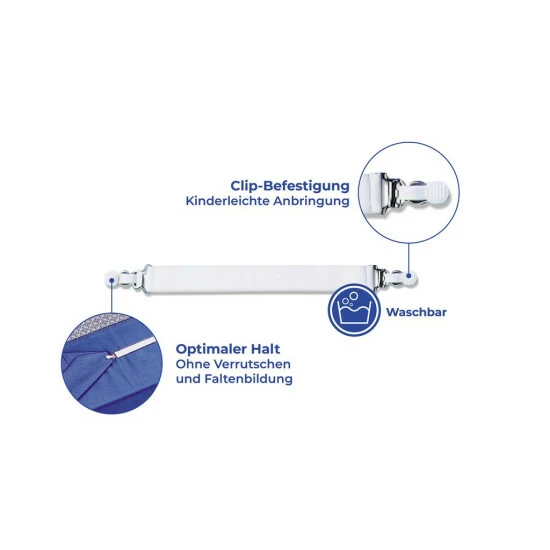 Die Anbringung ist kinderleicht. Die Enden der Betttuchspanner werden einfach an das Betttuch mit einem Clips befestigt und schon verrutscht das Tuch nicht mehr.