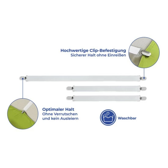 Wer kennt das nicht. Das Bett ist frisch bezogen und schon sieht es wieder unordentlich aus. Ausgeleierte Betttücher tragen ihren Anteil zum Chaos bei, und dabei hatte man sich doch solche Mühe gegeben. Mit dem Betttuchspanner können Spannbetttücher ab sofort einfach und langanhaltend gespannt werden. Die elastischen Betttuchspanner halten alle Tücher an Ort und Stelle. Einfach einen Spanner auf der Quer- und einen auf der Längsseite des Betttuches anbringen. Die hochwertigen Clips sorgen für sicheren Halt ohne Einreißen.