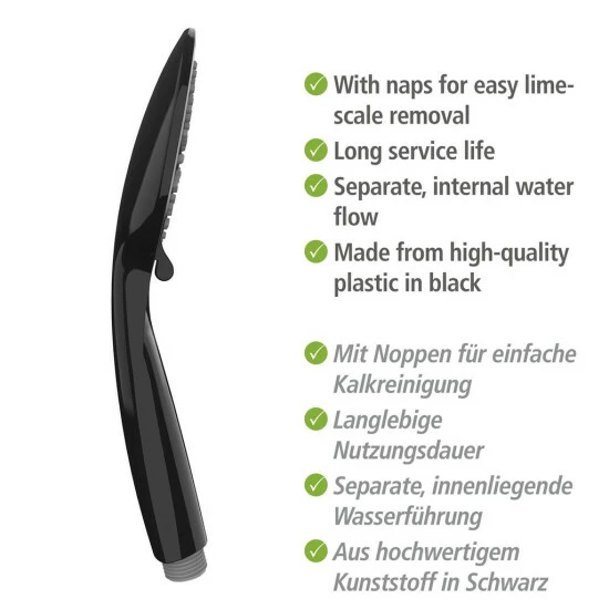 Entspannt gelingt auch die Reinigung des Duschkopfes mit Ø 11 cm aus ABS-Kunststoff. Seine Noppen ermöglichen eine einfache Reinigung. Kalkrückstände können mit den Fingern abgerieben werden. Die Handbrause verfügt über einen 1/2 Universalanschluss und ist für Durchlauferhitzer geeignet. Ergänzt wird die schicke Kombination in Schwarz durch einen passenden Duschschlauch (150 cm) aus Edelstahl mit einem 1/2 Standardanschluss. Der Schlauch ist belastbar, dehnbar und knickfest.