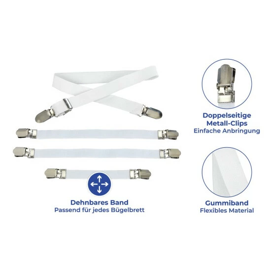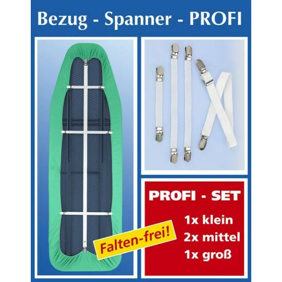 Die Profi Bügeltisch-Bezugsspanner können Sie für jedes gängige Bügelbrett verwenden. Durch den doppelseitigen Metall-Clip ist die Anbringung kinderleicht. Im Lieferumfang sind ein kleiner, zwei mittlere und ein extralanger Bezugsspanner enthalten.